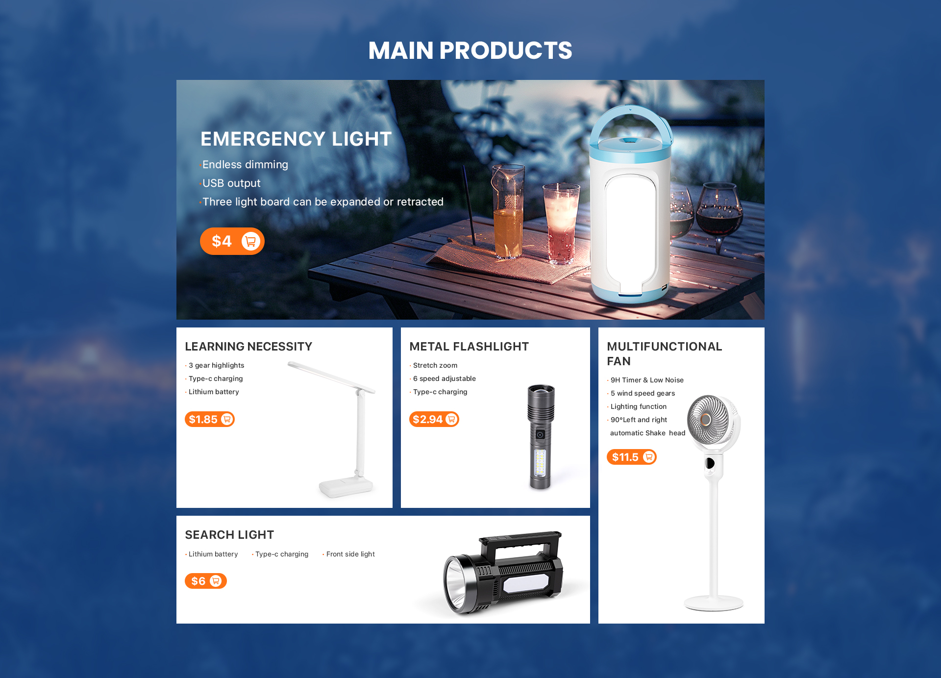 主营产品: 台灯、手电筒、应急灯、灯笼、电子蚊拍